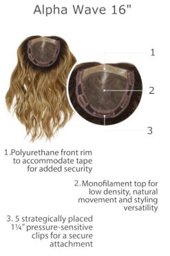 Alpha Wave 16″ by Raquel Welch. A beautiful versatile top-of-head piece that reflects today’s trending loose wave texture. It’s soft, sexy, beachy hair with an air of casual confidence. The monofilament top can be parted on the left, right or center for optimal flexibility.
