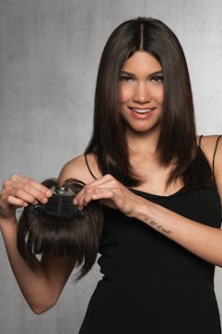 Fringe and fashion are frontline and center in this 100% human hair bangs. Our popular clip-in bang is now offered in high quality human hair so you can achieve any look you want. The monofilament crown connects the fringe and longer layers to sweep back to blend right into your hair. Application- Create a center part, place the straight line at the hairline and secure the clips. Tip – Customise the cut, colour and texture to get runway hair without the cutting or commitment.