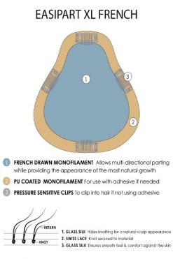 Easipart XL 12” Human Hair French Topper By Easihair. This Clip in topper is now available in French Drawn! The hair piece is designed to be worn over your existing part to give instant volume with a beautiful realistic look. The luxurious Remy Human Hair is 100% Hand Tied to a double monofiliament base using the French Drawn technique. All knots are protected and hidden to give the most beautiful natural look with the French Drawn technique. The monofilament base is wider than the Easipart 12″ to provide extra coverage and volume for early stages of hair loss.