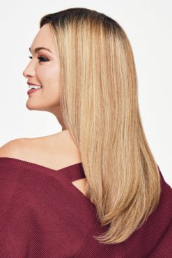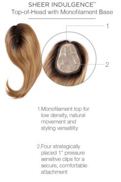 Go All Out 16″ Topper by Raquel Welch. New to Raquel’s range, the pear-shaped base of this elegant topper lets you position the smaller or wider end as needed to appropriately conceal the area of hair loss. An extended monofilament border lies flush to the head with no tell-tale edge. Our favorite feature – the soft, silky smooth extra layer that protects and comforts a sensitive scalp. Choose the 16” option to blend with shoulder length or longer hair.