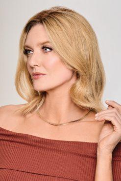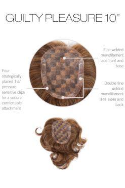 Guilty Pleasure 10″ Human Hair Topper by Raquel Welch. Treat yourself to pure luxury with this “barely there” 100% Remy human hair topper. Soon to be your new favorite for its ability to blend seamlessly thanks to a special reinforced thin edge and exquisite, hand-tied monofilament base for the ultimate in believable, natural-looking coverage.