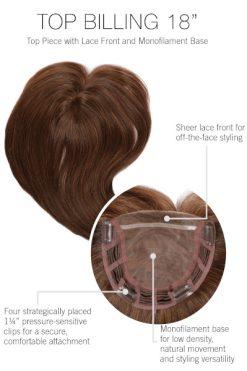 Top Billing 18″ Topper by Raquel Welch. A longer version of the popular, original 12” length is ideal for blending with styles that fall below the shoulders. The sheer lace front and monofilament base allow for a beautifully natural look whether parted left, right or center, and whether worn forward or off the face.