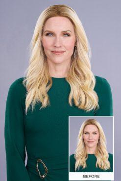 Graduating density transitions from a soft, light front to medium coverage at the crown and back for a balanced and polished appearance. Perfect for mid-progressive hair loss stages, the 18” length adds dramatic coverage and elegant movement.